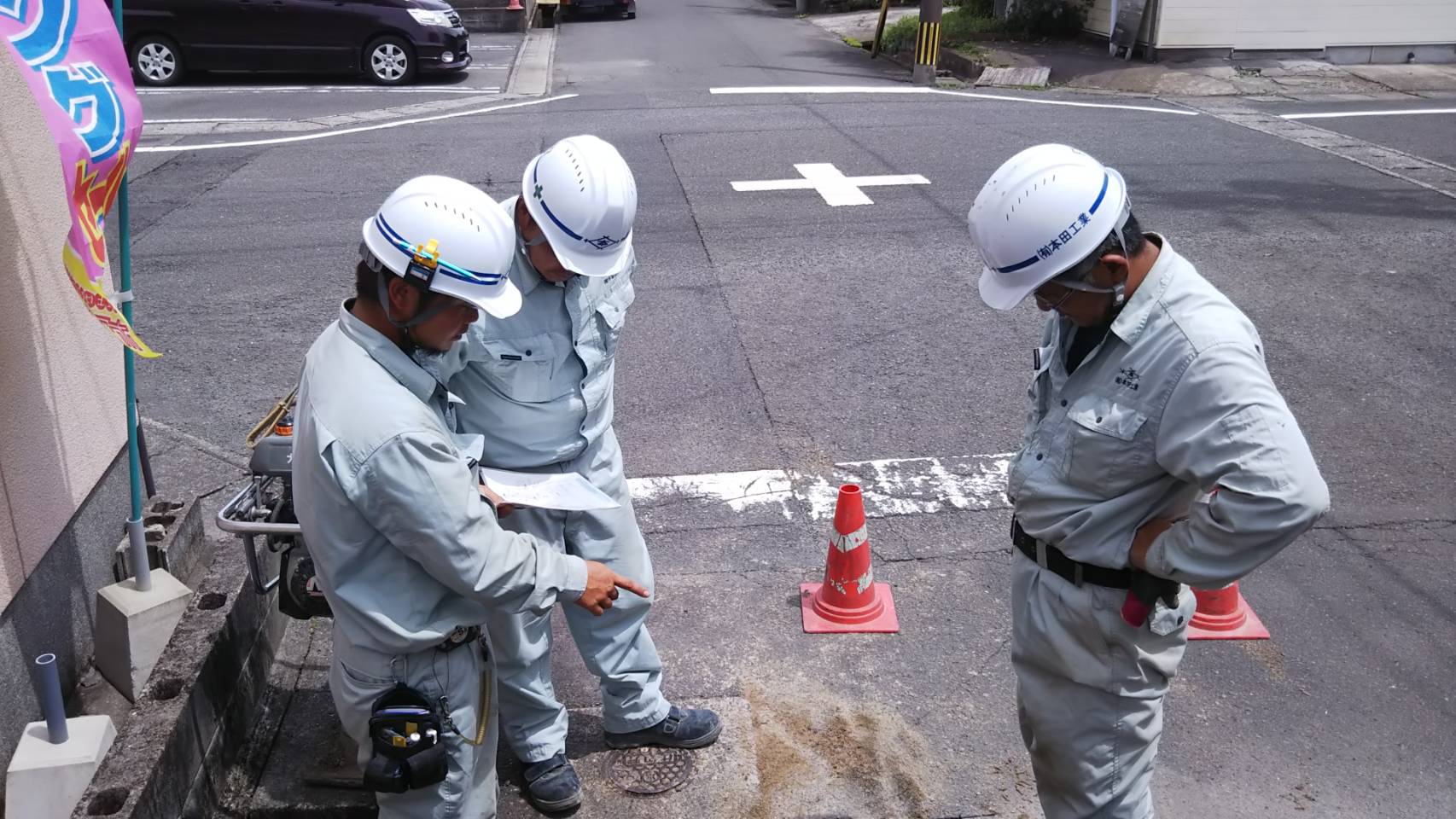 配管図を見ながら、舗装された道路を切り、人力で掘り、実際の位置を確認します。