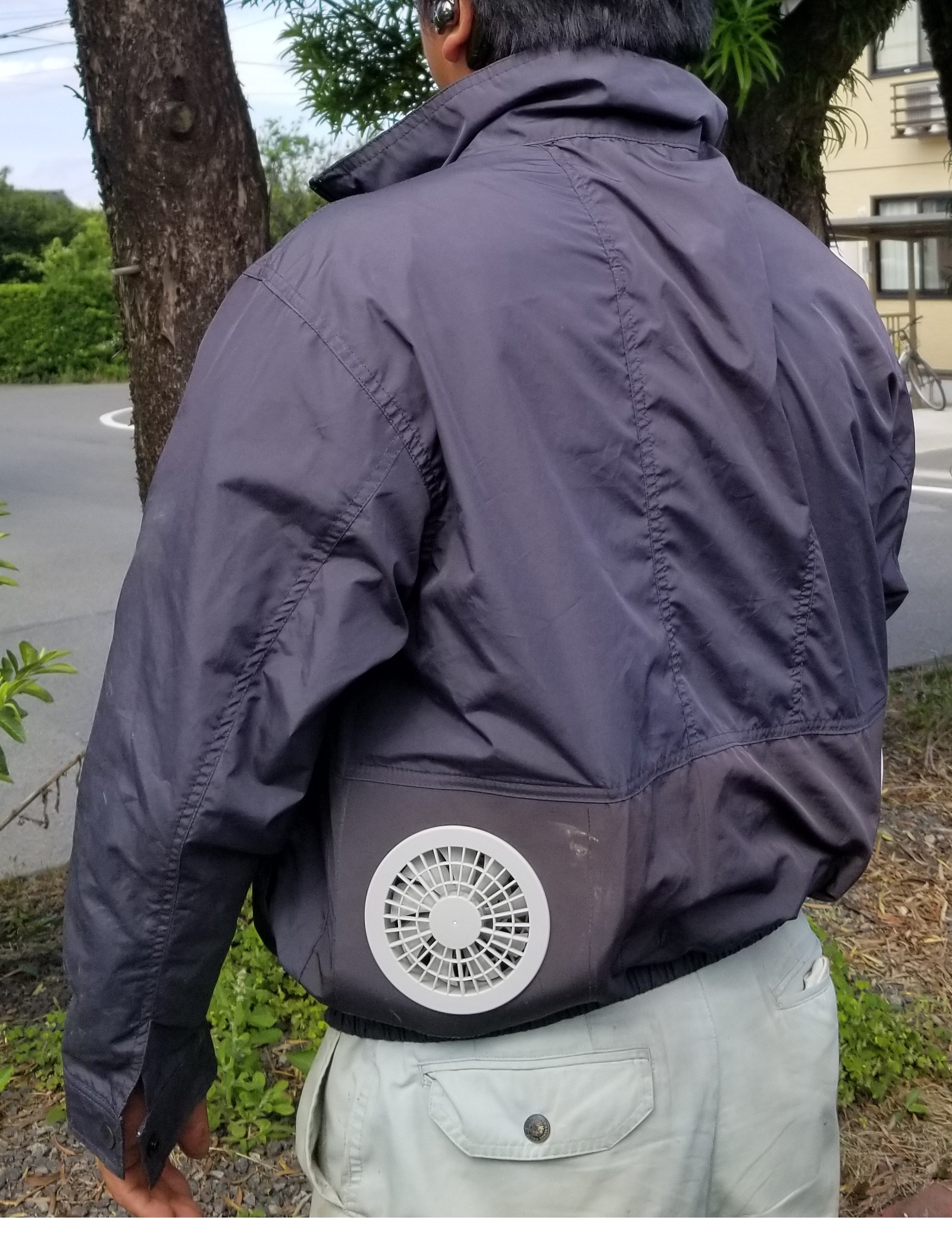 ジャケットの腰辺りに扇風機の小っちゃいヤツが付いてます。